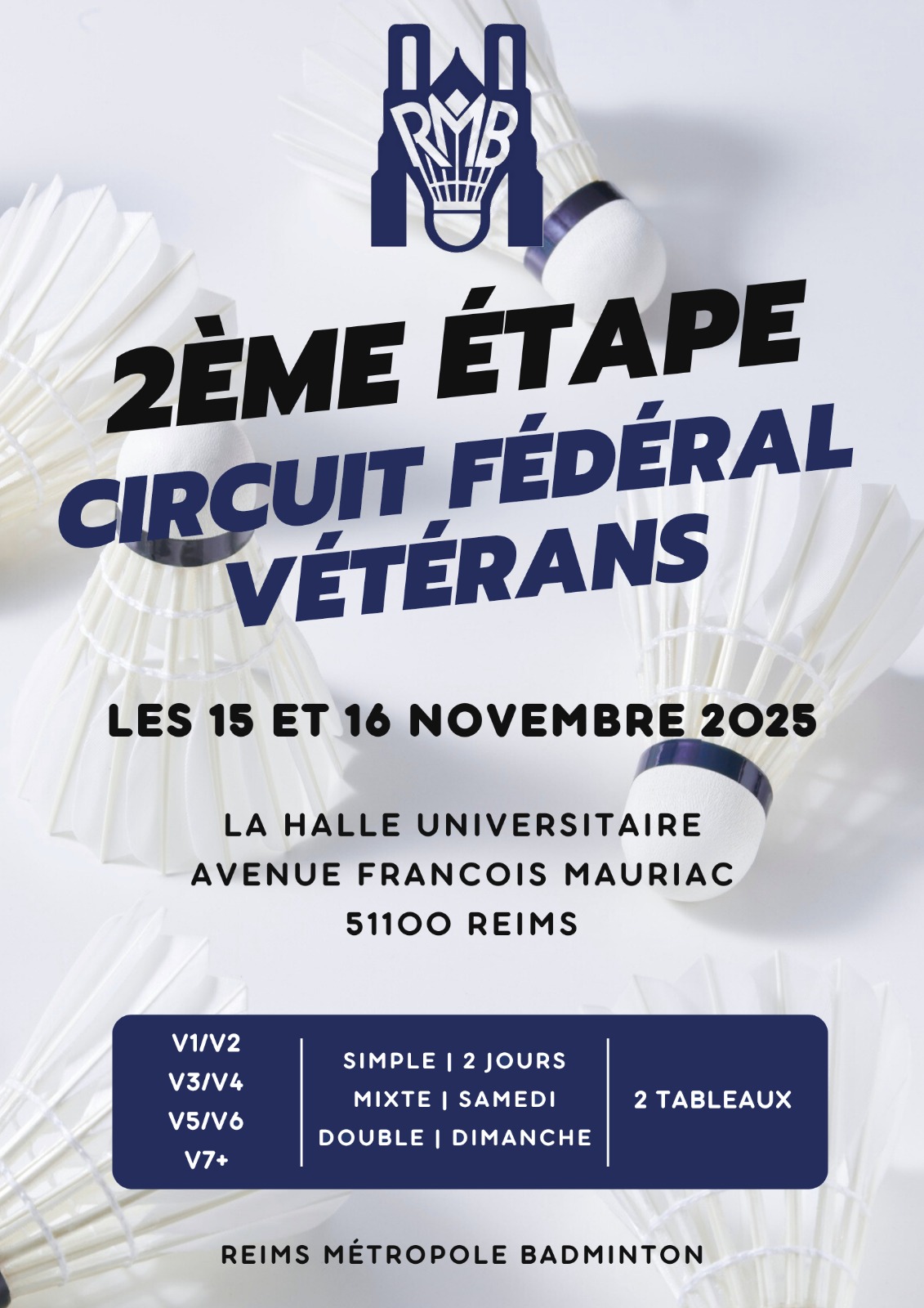 Inscription : https://badnet.fr/tournoi/public?eventid=32765 Plaquette : -- // RP : RP-Reims.pdf Nb terrains : 12 |